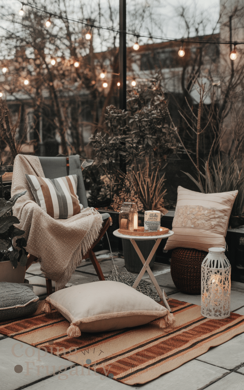 Creating a dedicated cozy corner with rugs and pillows and small tables makes your patio inviting and you can add lanterns and plants and string lights and blankets for chill evenings and it feels personal and relaxing and cozy corner setups are the ultimate cozy patio decor idea on a budget you’ll love this summer.