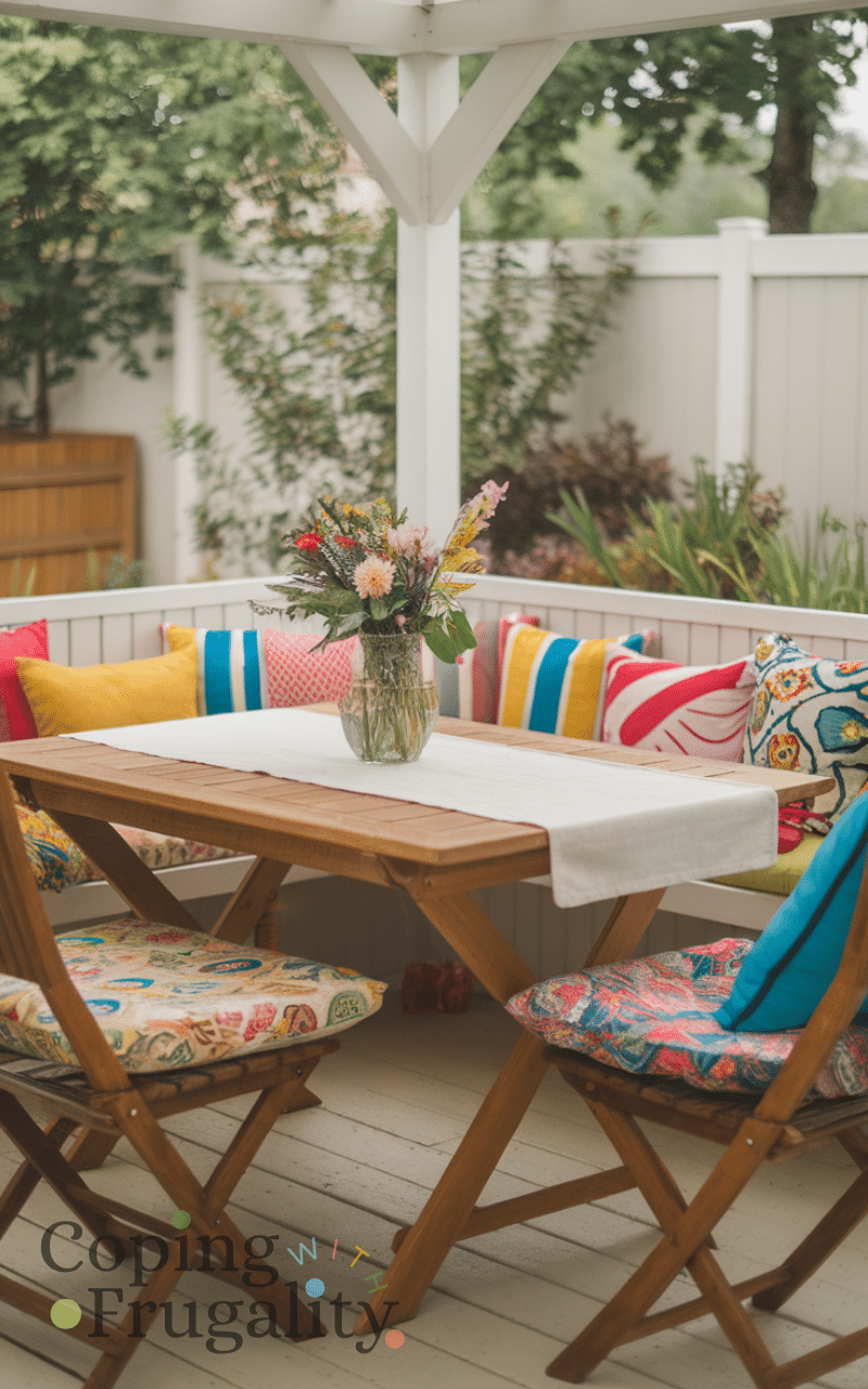 Adding colorful cushions instantly brightens your patio and makes seating areas more inviting and you can mix and match patterns and textures and use outdoor-safe fabrics and this is a simple and affordable way to refresh your patio and colorful cushions are a must-try cozy patio decor idea on a budget you’ll love this summer.