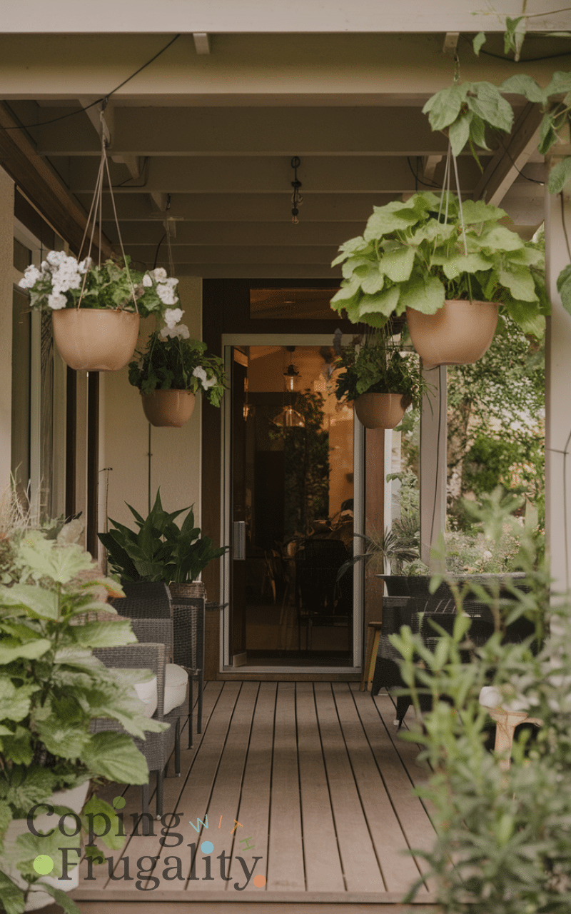 Hanging planters make use of vertical space and free up floor space and you can hang them from the ceiling or walls and fill them with flowers or succulents and they give your patio a stylish and lush look and hanging planters are a smart and cozy patio decor idea on a budget you’ll love this summer.