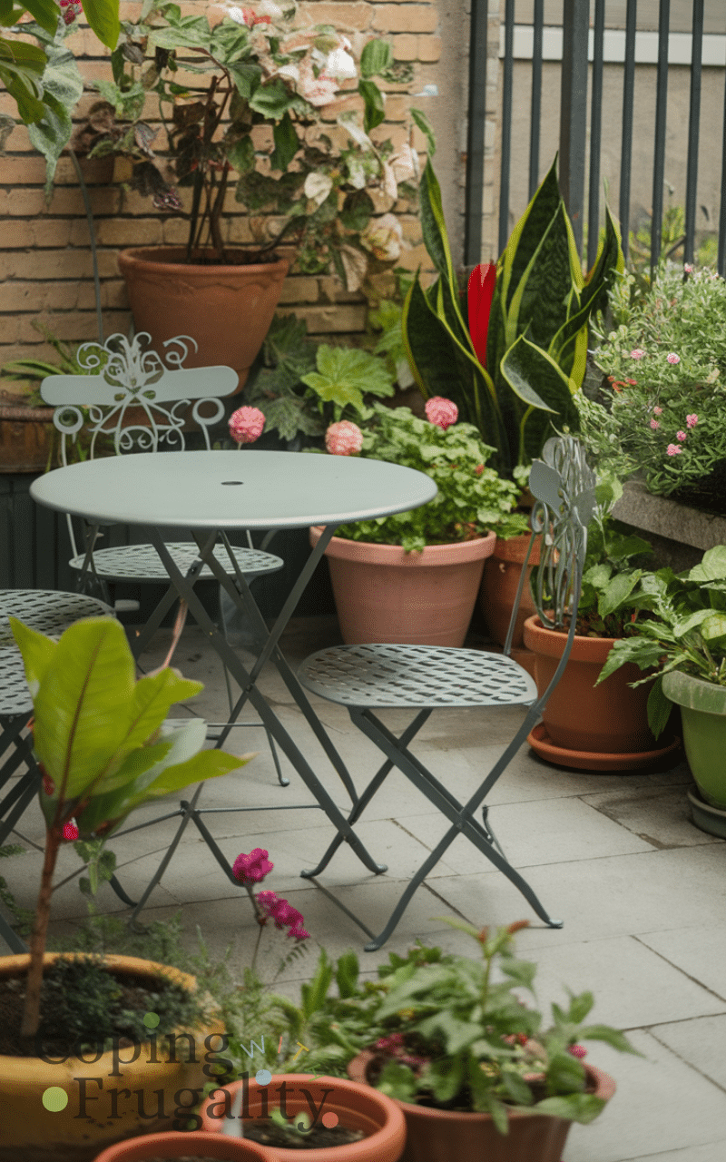 Adding potted plants creates a refreshing and lively atmosphere and you can use flowers or greenery and arrange them in corners or along the edges and using different sizes and colors adds depth and personality and plants are natural and inexpensive decorations and incorporating potted plants is a cozy patio decor idea on a budget you’ll love this summer.