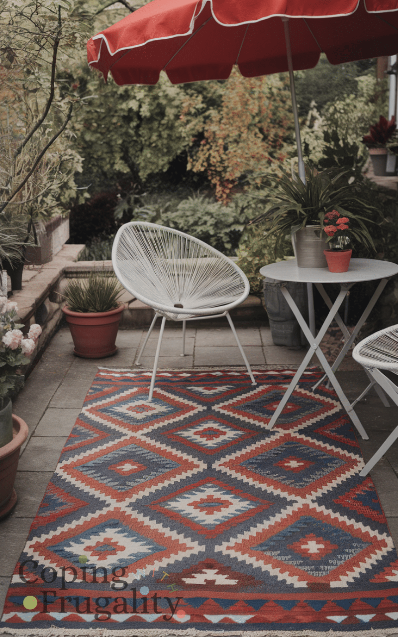 Laying a bright outdoor rug brings color and comfort to your patio and rugs can define seating areas and make the space feel homey and you can find inexpensive options that look luxurious and they are easy to clean and maintain and outdoor rugs are an amazing cozy patio decor idea on a budget you’ll love this summer.