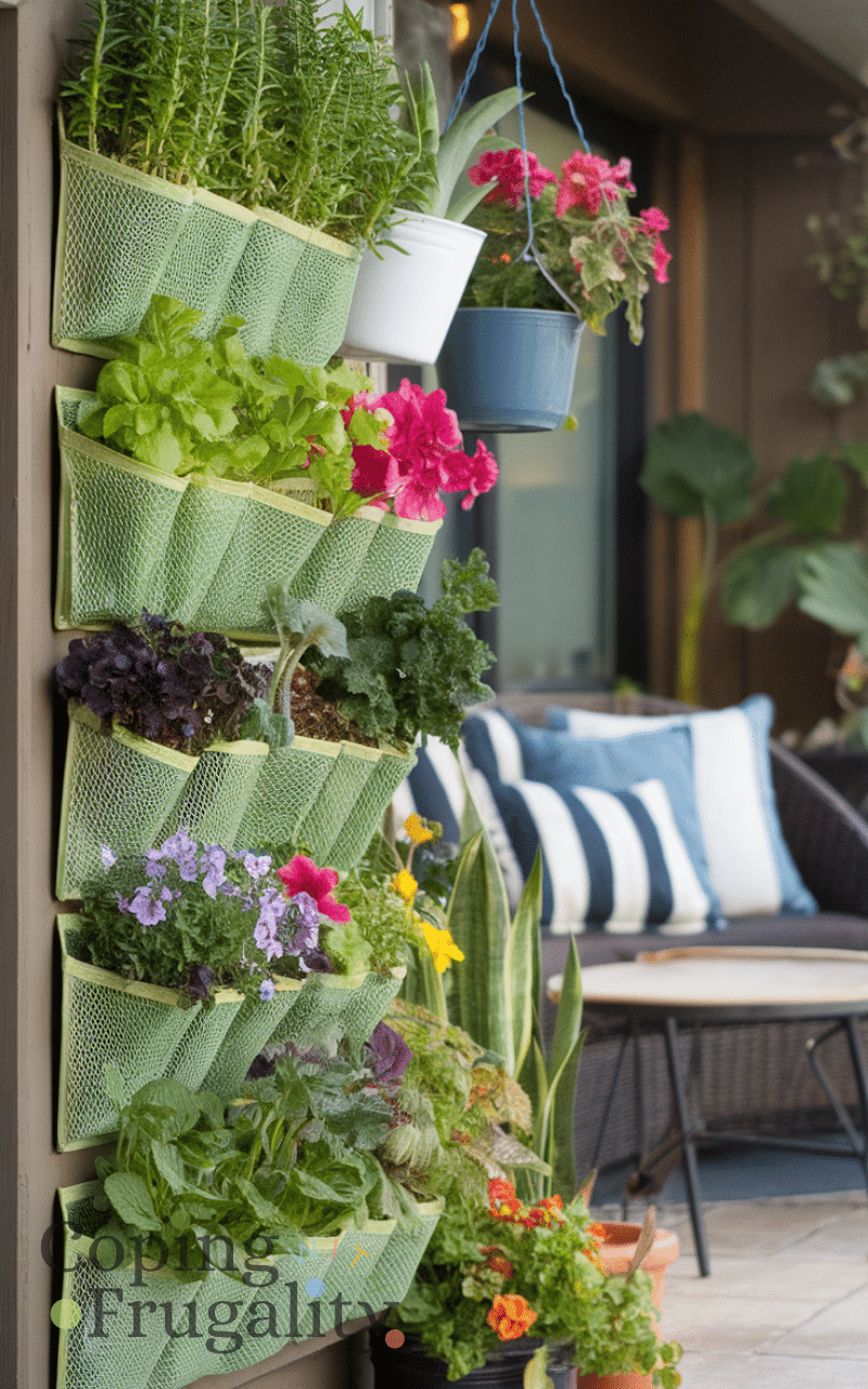 Creating a vertical garden saves space and adds greenery and you can use pocket planters or hanging pots and mix herbs and flowers and it is inexpensive and visually stunning and vertical garden walls are a refreshing cozy patio decor idea on a budget you’ll love this summer.