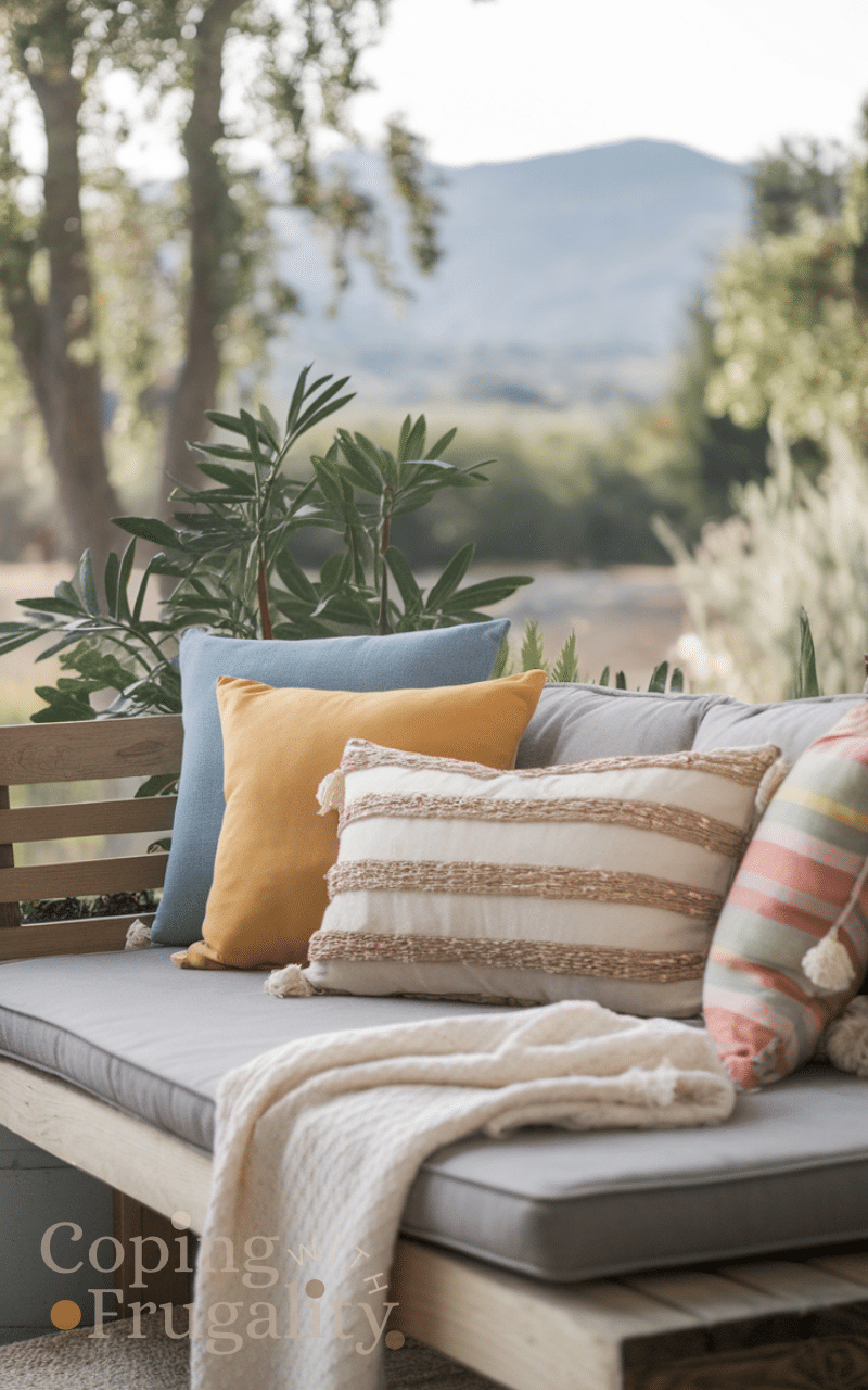 Adding a cushioned bench makes seating practical and cozy and you can use pallets or buy a simple bench and add colorful cushions and blankets and it invites guests to sit and relax and outdoor cushioned benches are a wonderful cozy patio decor idea on a budget you’ll love this summer.