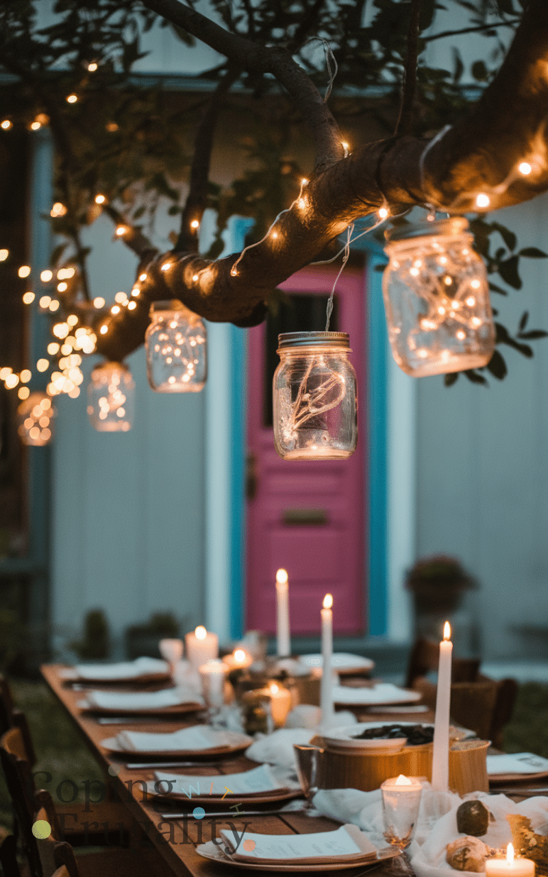 Placing fairy lights in jars creates magical lighting and you can use mason jars or recycled glass jars and hang them or place them on tables and it is cheap and enchanting and perfect for summer evenings and fairy lights in jars are a whimsical cozy patio decor idea on a budget you’ll love this summer.