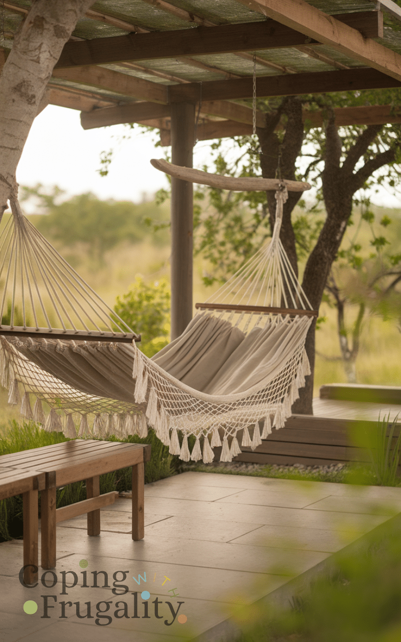 Adding a hammock or swing chair creates relaxation and fun and you can hang it in a corner or between two posts and it provides comfort and a playful feel and is perfect for summer lounging and hammocks or swing chairs are a delightful cozy patio decor idea on a budget you’ll love this summer.