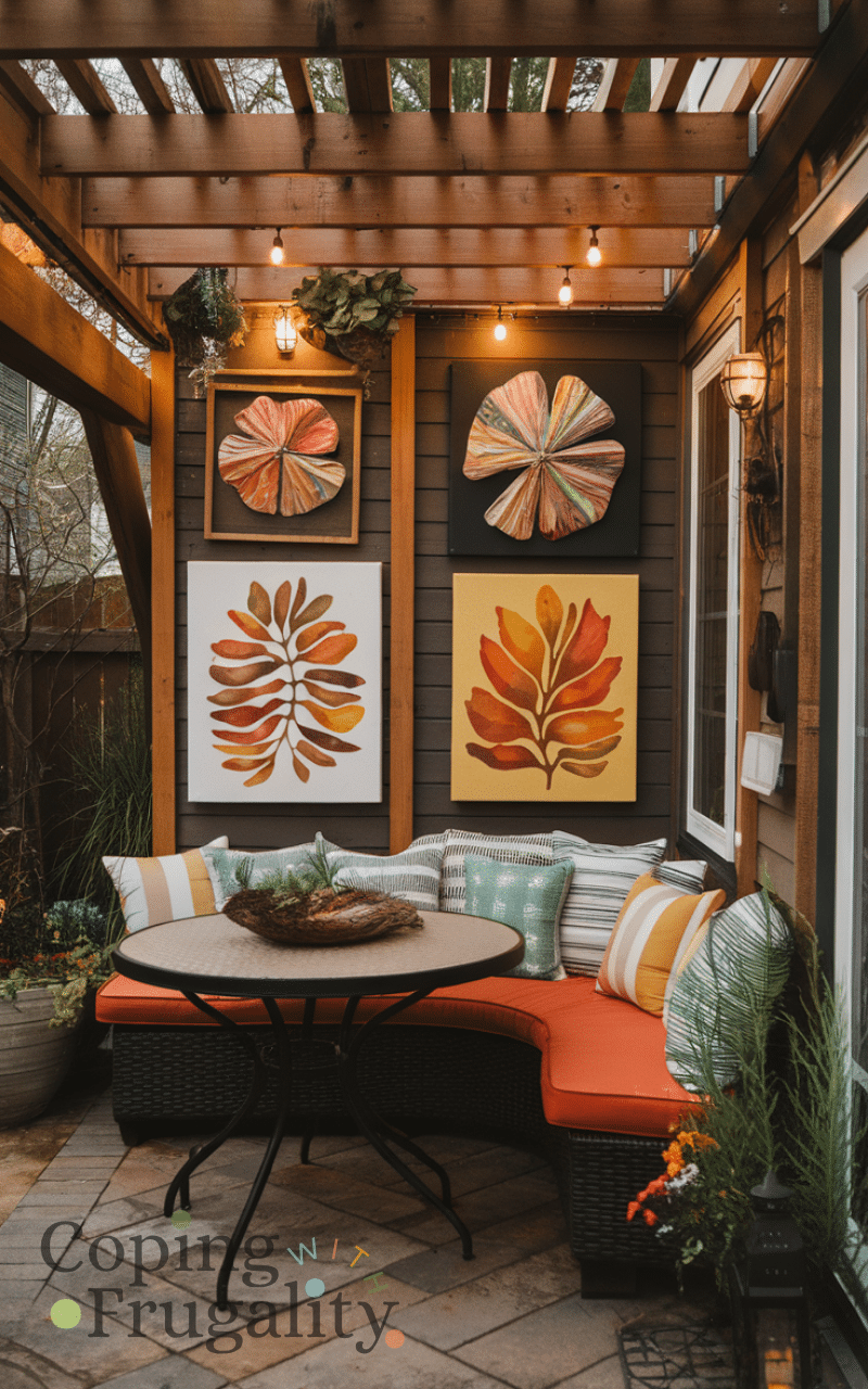 Decorating your patio walls with outdoor-safe artwork makes the space unique and you can use frames or canvas or metal art and choose bright or natural designs and it is inexpensive and reflects your personality and outdoor artwork is an exciting cozy patio decor idea on a budget you’ll love this summer.