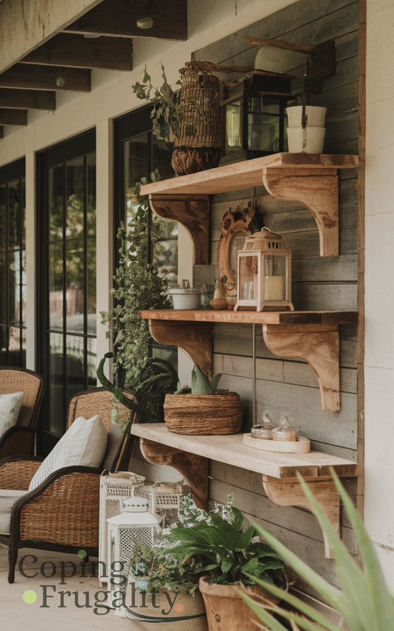 Adding shelves made from reclaimed wood gives your patio storage and charm and you can display plants or lanterns or small decorations and the rustic look adds personality and they are cheap and easy to install and reclaimed wood shelves are a smart cozy patio decor idea on a budget you’ll love this summer.