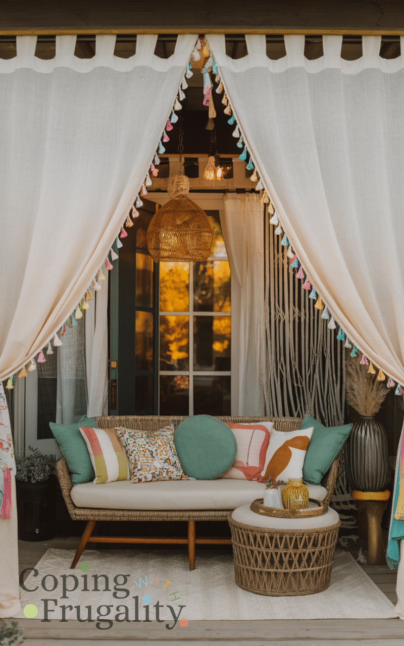 Hanging outdoor curtains makes your patio feel private and cozy and you can choose light fabrics and playful colors and tie them back during the day and close them in the evening and they also block the sun and add a romantic vibe and outdoor curtains are a charming cozy patio decor idea on a budget you’ll love this summer.