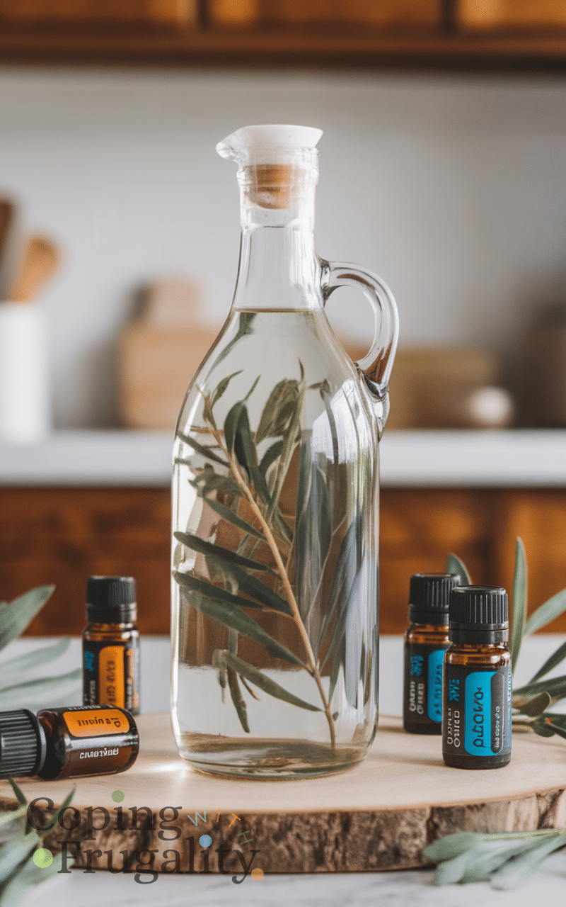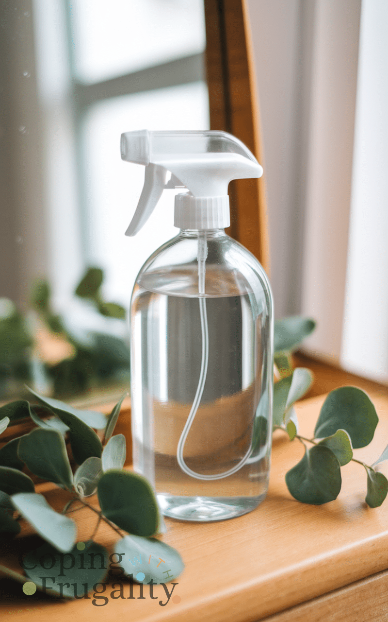 Eucalyptus glass cleaner is a clear natural cleaning solution on a budget that smell amazing because it mixes vinegar water and eucalyptus essential oil to clean mirrors and windows streak-free and it also leaves a refreshing aroma that brightens up your home and you can simply spray it on glass surfaces and wipe with a microfiber cloth for sparkling results and this natural cleaning solution on a budget that smell amazing is perfect for a fresh and natural clean without harsh chemicals and it makes cleaning glass feel effortless and fragrant.