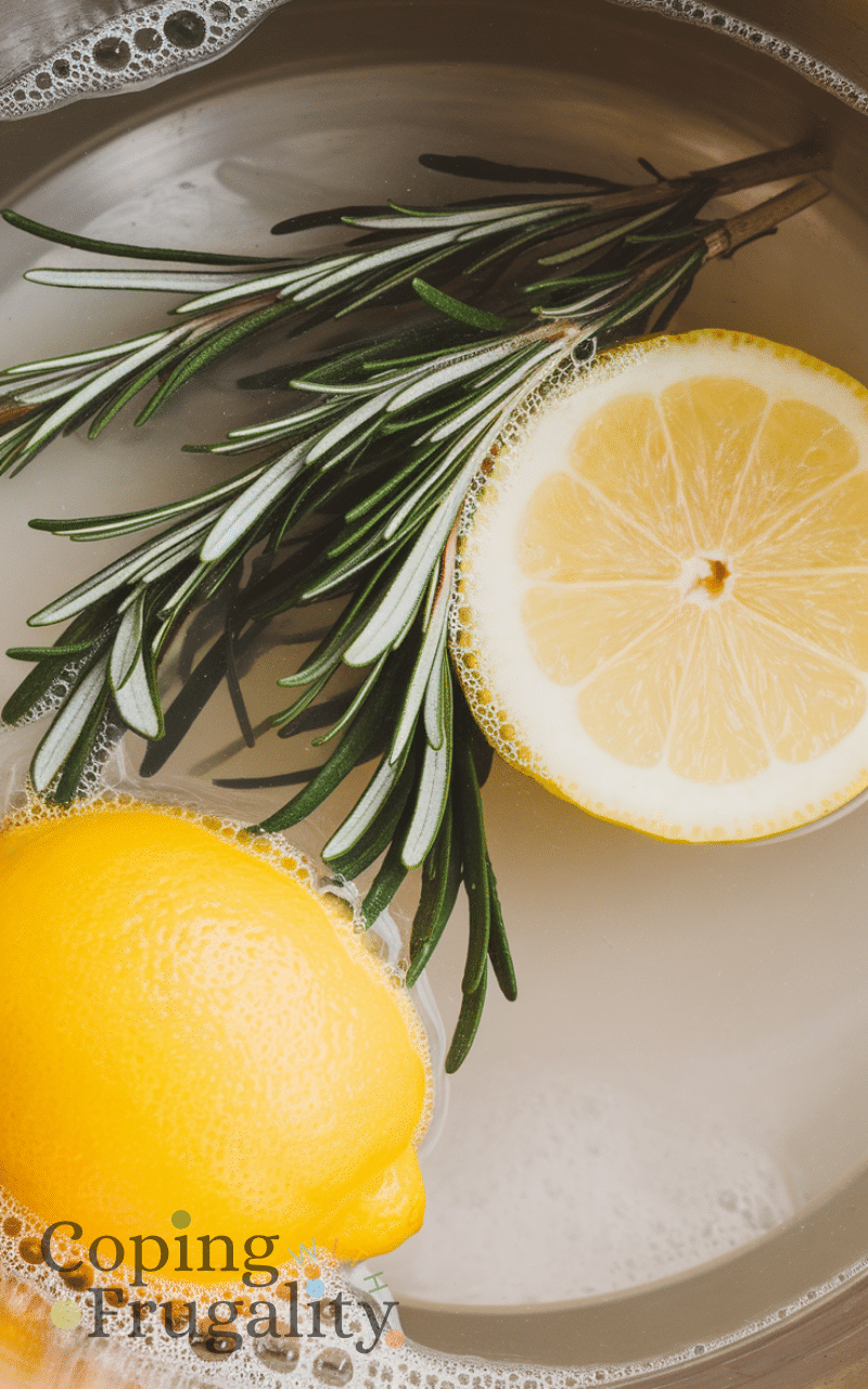 Rosemary and lemon floor wash is a refreshing natural cleaning solution on a budget that smell amazing because it combines rosemary sprigs and lemon juice in hot water to create a fragrant floor cleaner and you can mop your floors with it and enjoy the herbal citrus scent lingering in your home and it works well for tile wood and laminate floors and this natural cleaning solution on a budget that smell amazing is simple to prepare and very effective plus it will make your floors shine naturally and your home will smell clean and fresh all the time.