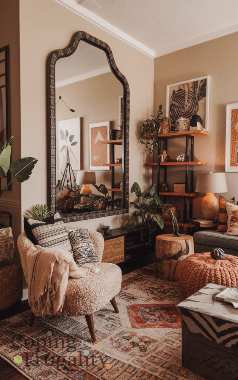 Adding a statement mirror enhances a room because it reflects light makes the space feel bigger and serves as decor at the same time also choosing a mirror with a unique frame adds style and personality without costing a fortune and placing it strategically on walls or leaning against a corner makes your home feel bright airy and elegant giving an expensive look effortlessly which makes this a key boho home decor idea on a budget that looks expensive.