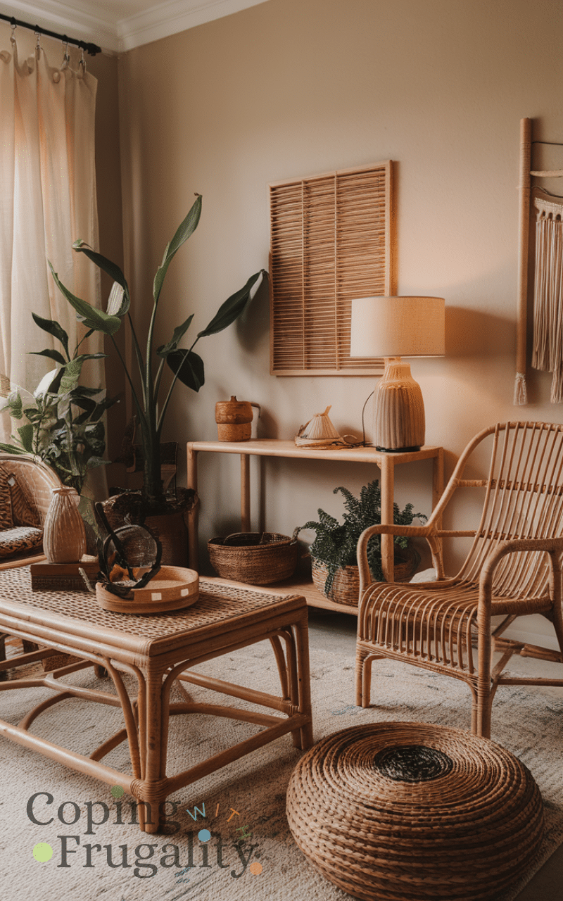 Incorporating rattan and woven elements like chairs baskets and trays instantly adds texture and warmth because natural materials create an airy light feel and they bring a sense of bohemian charm while remaining affordable also mixing these pieces with other decor items enhances the overall design and makes your space feel sophisticated and relaxed showing how simple materials can make a big impact and this is a classic boho home decor idea on a budget that looks expensive.