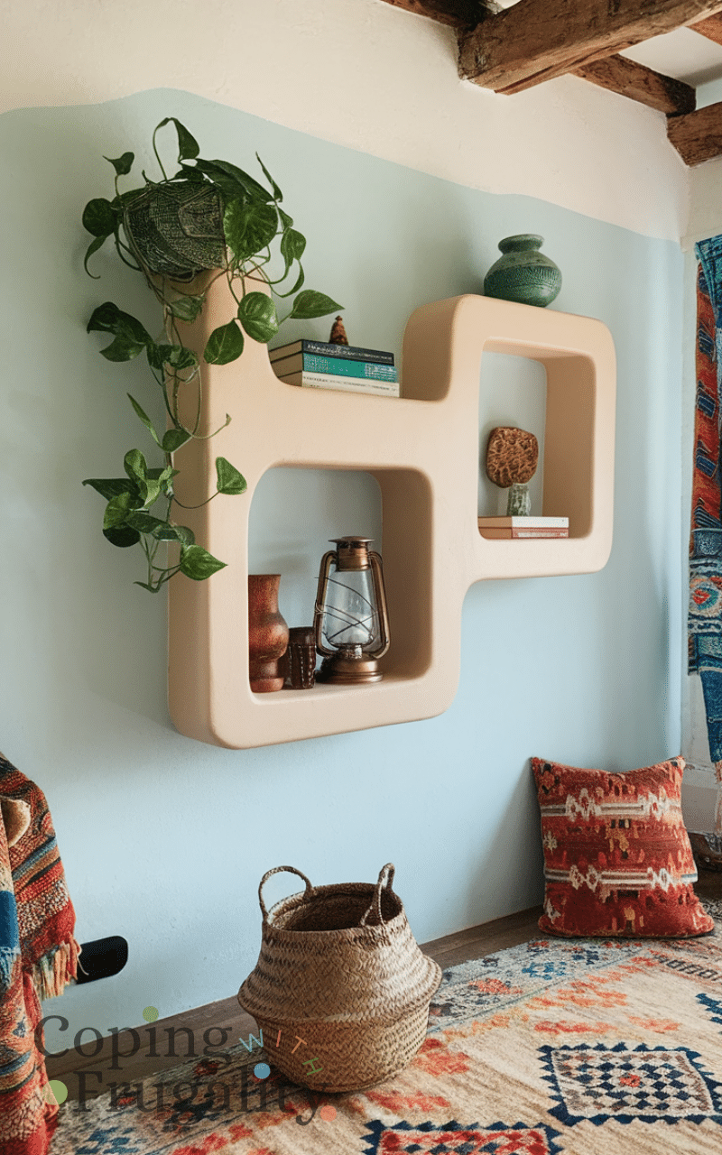 Installing decorative wall shelves is practical and stylish because they display books plants and accessories in an organized way and adding colorful or textured items enhances the boho vibe while staying budget-friendly also creative arrangements make walls look curated and expensive without spending a fortune making this a clever boho home decor idea on a budget that looks expensive.