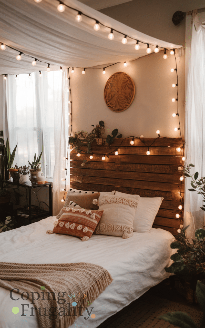 Adding string lights or lanterns creates a magical ambiance in any room because soft lighting brings warmth and charm and is very budget-friendly also draping lights over a headboard around windows or along walls enhances the boho atmosphere making your home feel cozy and chic without spending too much making this a perfect boho home decor idea on a budget that looks expensive.