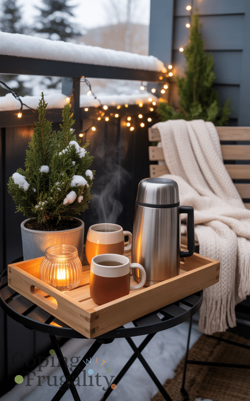 The ultimate idea for balcony decorating for cold weather on a budget is a small hot drink station. A tray with mugs, a thermos, and cozy accessories turns your balcony into a winter escape. It’s affordable, practical, and encourages you to enjoy your balcony even on cold days.