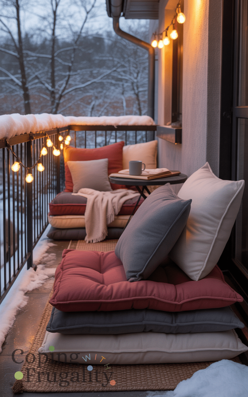Floor seating is a clever trick for balcony decorating for cold weather on a budget. Thick cushions or repurposed pillows add insulation and comfort. You can stack them when not in use and bring them indoors during rain. This approach saves money on bulky furniture while keeping your balcony flexible and cozy.