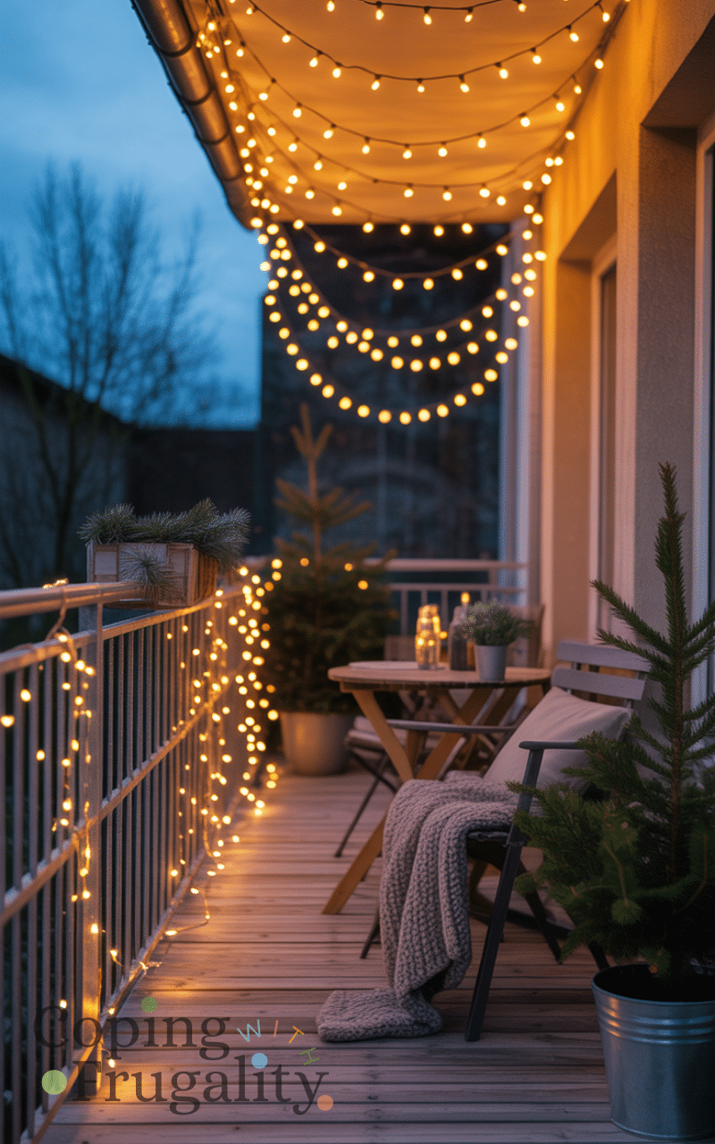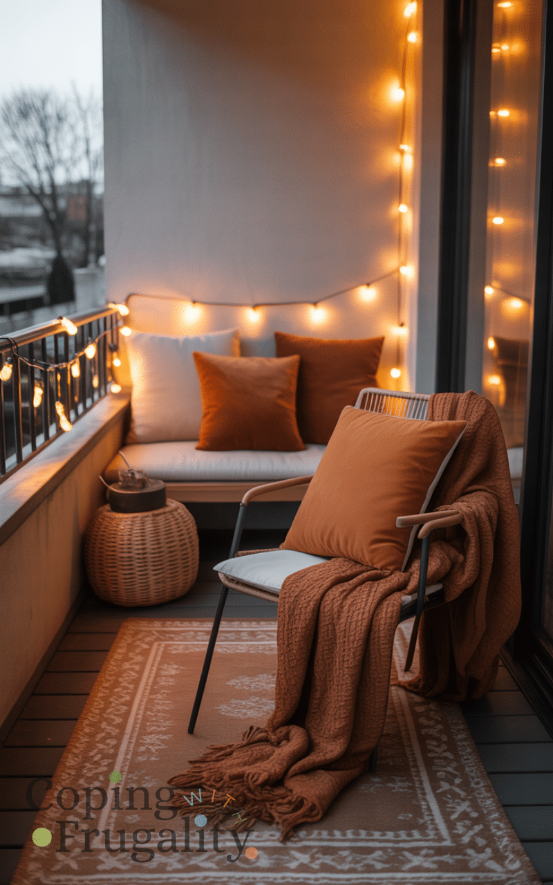 Lighting plays a huge role in balcony decorating for cold weather on a budget. Warm-toned string lights or solar fairy lights add instant coziness without increasing electricity costs. Wrap them around railings or hang them overhead for a soft glow. Proper lighting makes your balcony feel warmer and more welcoming, even on dark winter evenings.