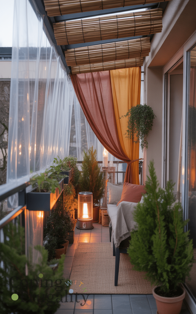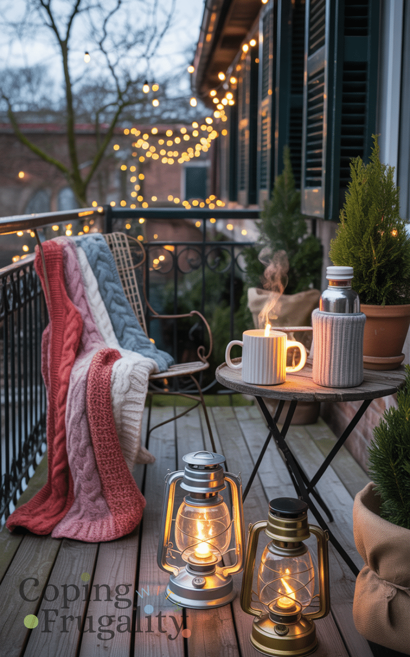 Instead of expensive heaters, think creatively for balcony decorating for cold weather on a budget. Candles in lanterns, insulated mugs, or hot water bottles can add both warmth and ambiance. While not a full heating solution, these small touches make cold evenings more comfortable and visually appealing.