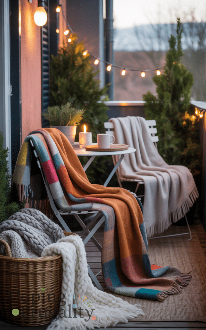 Blankets are a must for balcony decorating for cold weather on a budget. Fleece, knit, or recycled fabric throws are affordable and incredibly effective for warmth. Drape them over chairs or store them in a basket for easy access. You don’t need luxury blankets—simple, budget-friendly options work perfectly and instantly make your balcony feel inviting, comfortable, and winter-ready.
