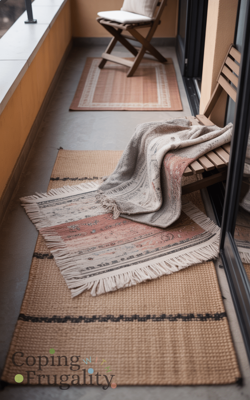 One of the easiest ways to start balcony decorating for cold weather on a budget is by layering outdoor rugs. Rugs instantly add warmth underfoot and visually soften cold concrete or tile floors. Look for second-hand rugs, discounted outdoor mats, or even indoor rugs you can rotate seasonally. Layering two thin rugs is cheaper than buying one thick winter rug and gives your balcony a cozy, lived-in feel while protecting your feet from the cold.