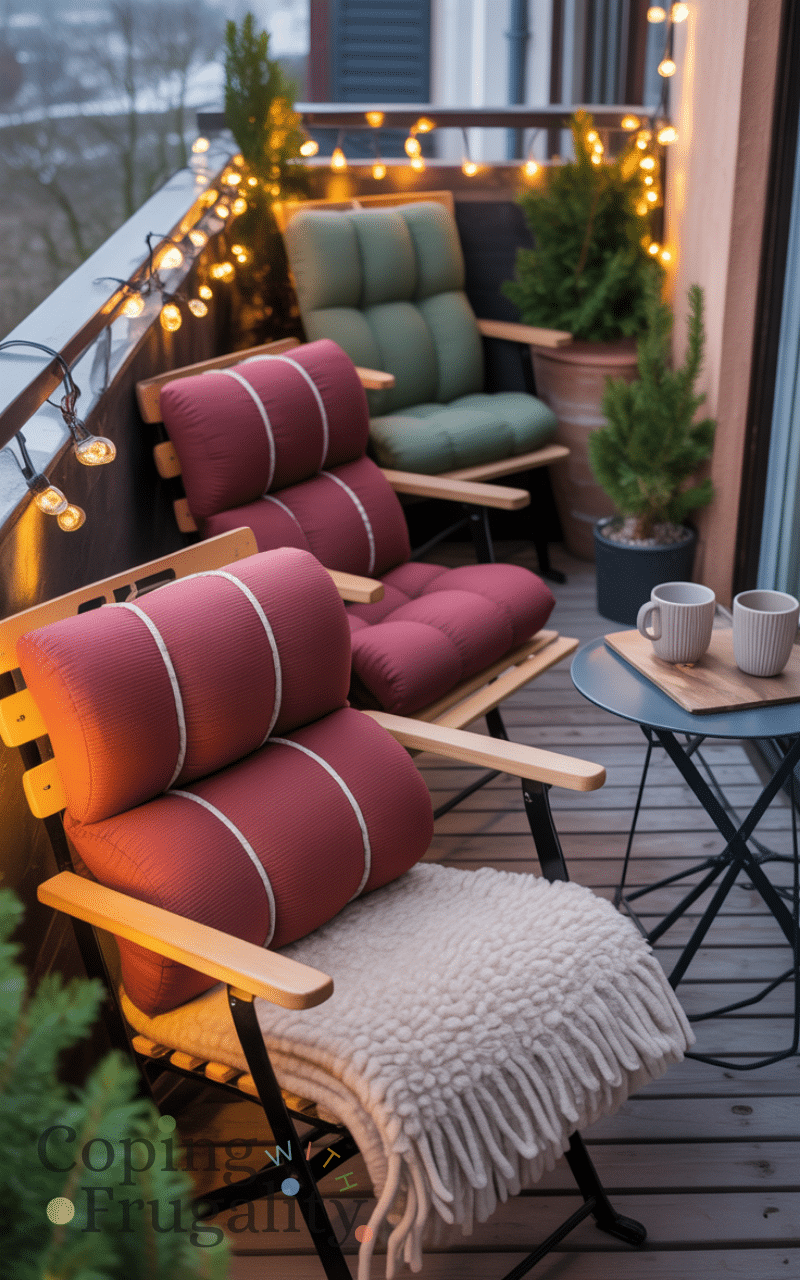 Add insulation to chairs using foam pads, old yoga mats, or layered fabric for balcony decorating for cold weather on a budget. This prevents cold from seeping through seating and improves comfort. It’s a simple DIY solution that costs very little but makes a big difference.