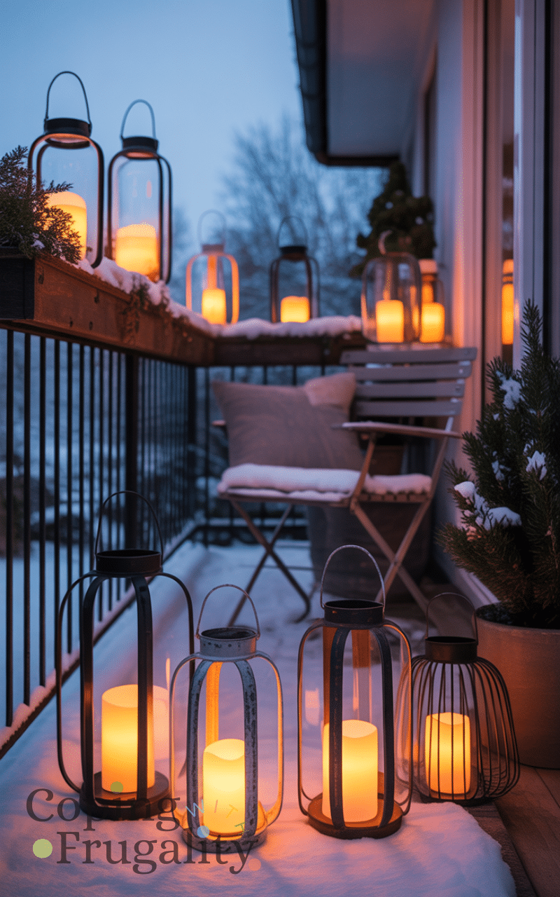 Lanterns are affordable, stylish, and perfect for balcony decorating for cold weather on a budget. Use LED candles for safety or real candles for warmth and atmosphere. Lanterns create a cozy glow that makes cold evenings feel intimate and relaxing.