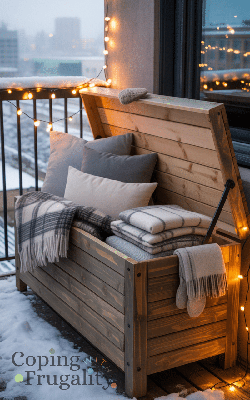 Storage benches are a smart investment for balcony decorating for cold weather on a budget. You can store blankets, cushions, and winter accessories inside while using the bench as seating. DIY or second-hand benches keep costs low while maximizing functionality.