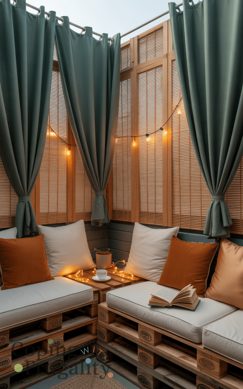 Create a small enclosed nook for balcony decorating for cold weather on a budget using folding screens, curtains, or pallets. This traps warmth and creates a cozy corner perfect for reading or enjoying tea. It’s an affordable way to make your balcony feel like an extra indoor room.