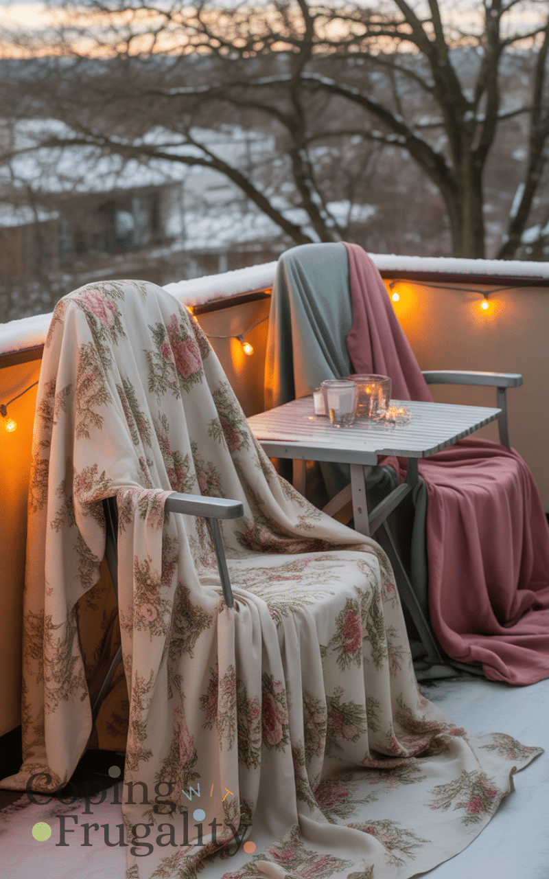 Old sheets, tablecloths, or furniture covers work wonders in balcony decorating for cold weather on a budget. They protect furniture from moisture and cold while adding texture and color. This simple hack extends the life of your furniture without buying expensive winter covers.
