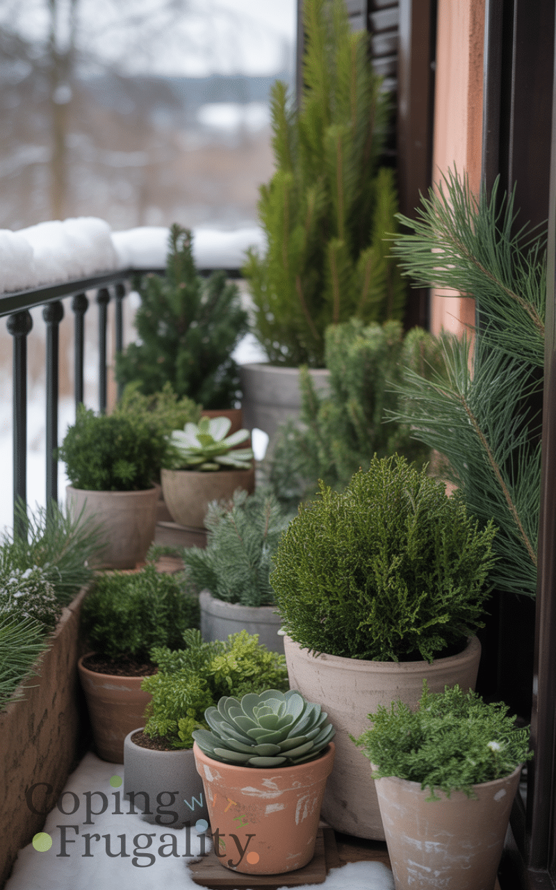 Greenery is still possible in winter. Choose hardy plants like evergreens or faux plants for balcony decorating for cold weather on a budget. Faux plants are low-cost and maintenance-free, while real winter plants add life without needing much care. Either option keeps your balcony feeling fresh and alive year-round.