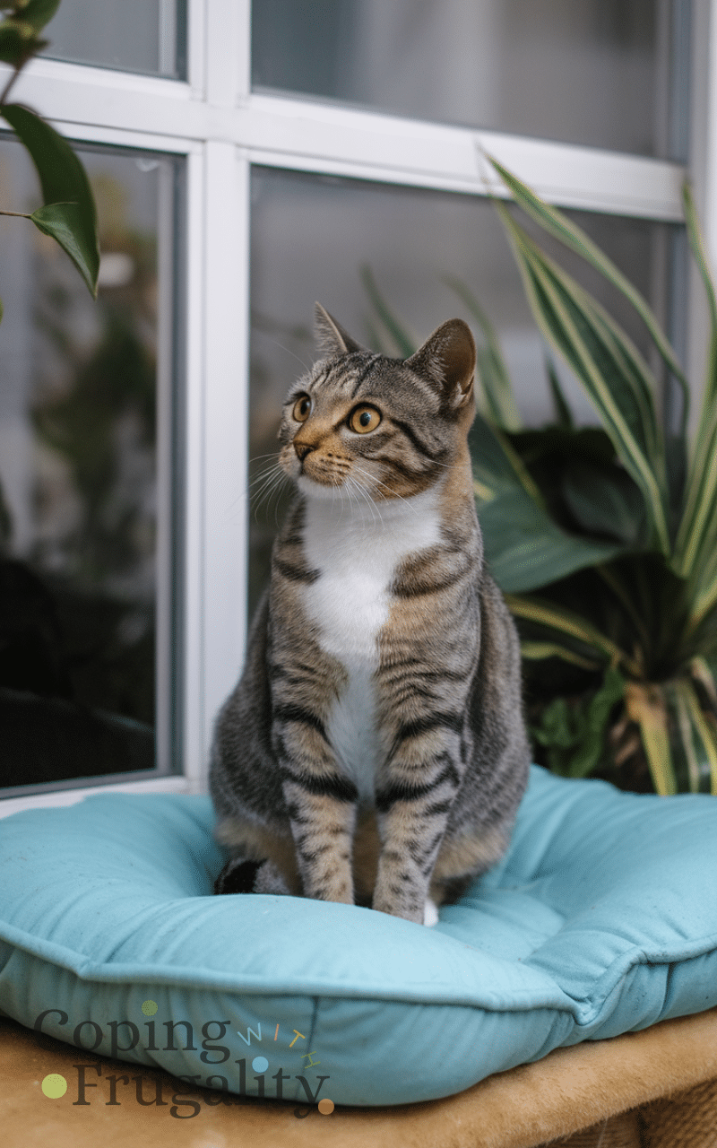 If you already have a window sill, adding a cushion is one of the simplest cat window perch ideas without drilling on a budget. A soft pillow or foam pad secured with non-slip material instantly turns the sill into a cozy perch. This approach costs very little and works especially well for older cats who prefer stable surfaces. It’s an easy upgrade that provides comfort without any installation effort.