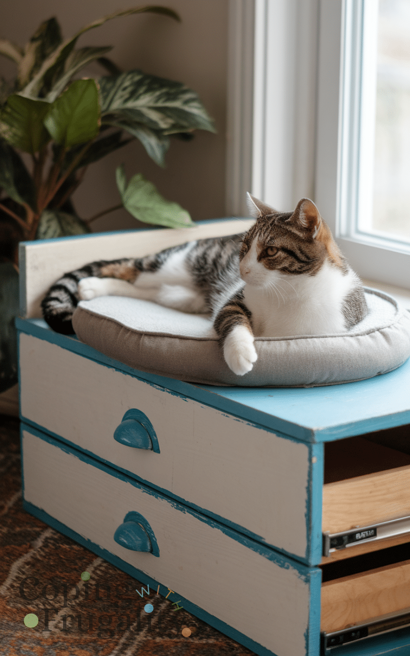 Repurposing an old drawer into a window perch is a creative and affordable solution. This cat window perch idea without drilling on a budget involves placing the drawer securely on a window sill or table. Adding padding and securing it against movement creates a cozy and safe lounging space.