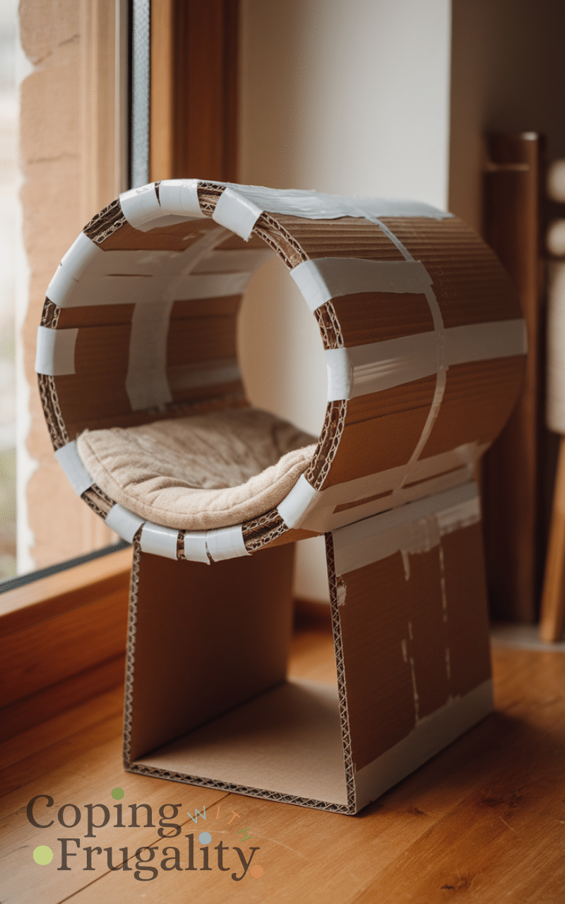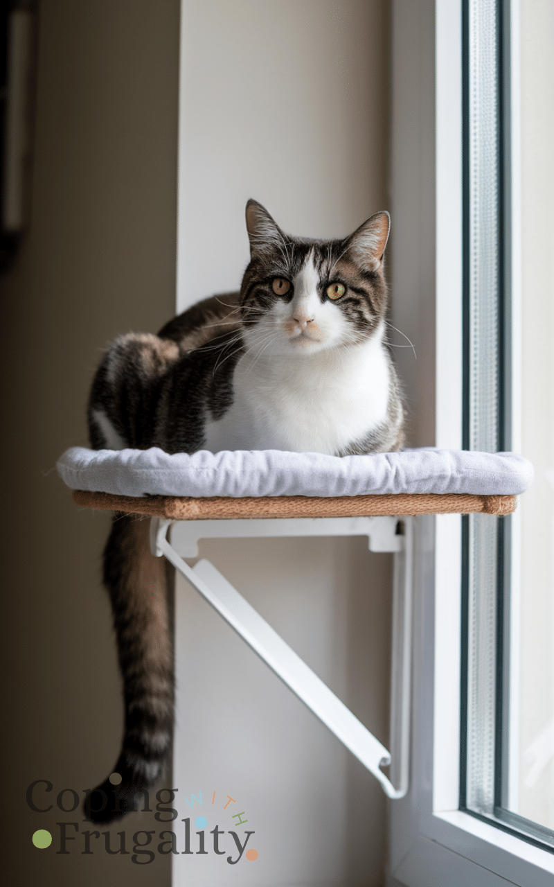 A DIY cardboard perch is one of the most budget-friendly cat window perch ideas without drilling. Using thick cardboard and reinforcing it properly can create a sturdy platform. Covering it with fabric or a mat improves comfort and appearance. This option is ideal for cat owners who enjoy DIY projects and want a low-cost solution that’s easy to replace if worn out.