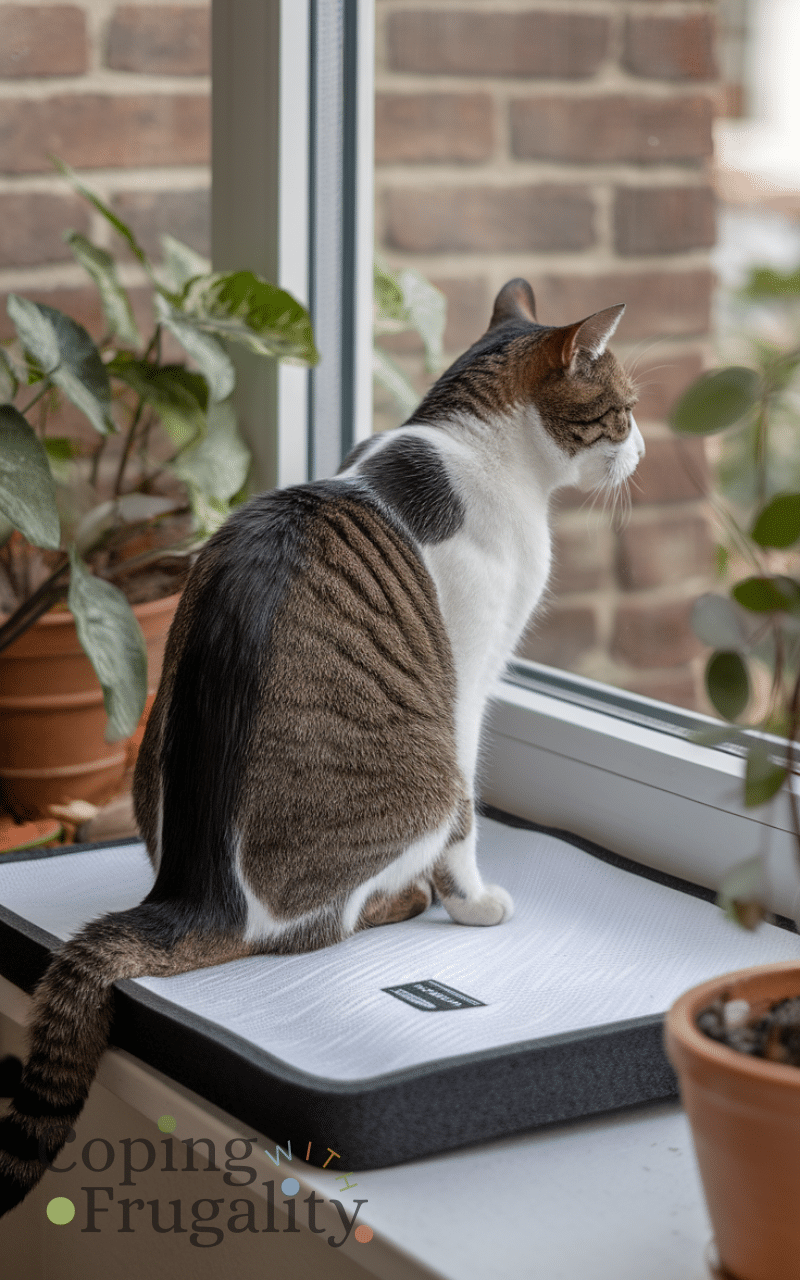 Using a foam mat with an anti-slip base on a window sill or table is a simple cat window perch idea without drilling on a budget. Foam mats are inexpensive and provide insulation and comfort. This setup works well for cats who prefer soft surfaces and allows easy repositioning without any permanent changes.
