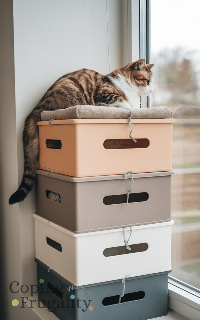Stackable storage boxes can be arranged to create a raised perch near a window. This cat window perch idea without drilling on a budget is flexible and affordable. Securing the boxes together ensures stability. Topping them with a cushion or mat creates a comfortable lounging area that cats love.