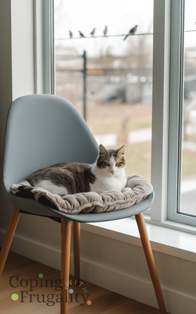 Placing a chair or stool near a window is a smart cat window perch idea without drilling on a budget. Adding a cushion or blanket creates a comfortable resting spot with a view. This solution requires no installation and uses furniture you may already own. It’s perfect for cats who enjoy lounging while watching birds and outdoor activity from a safe height.