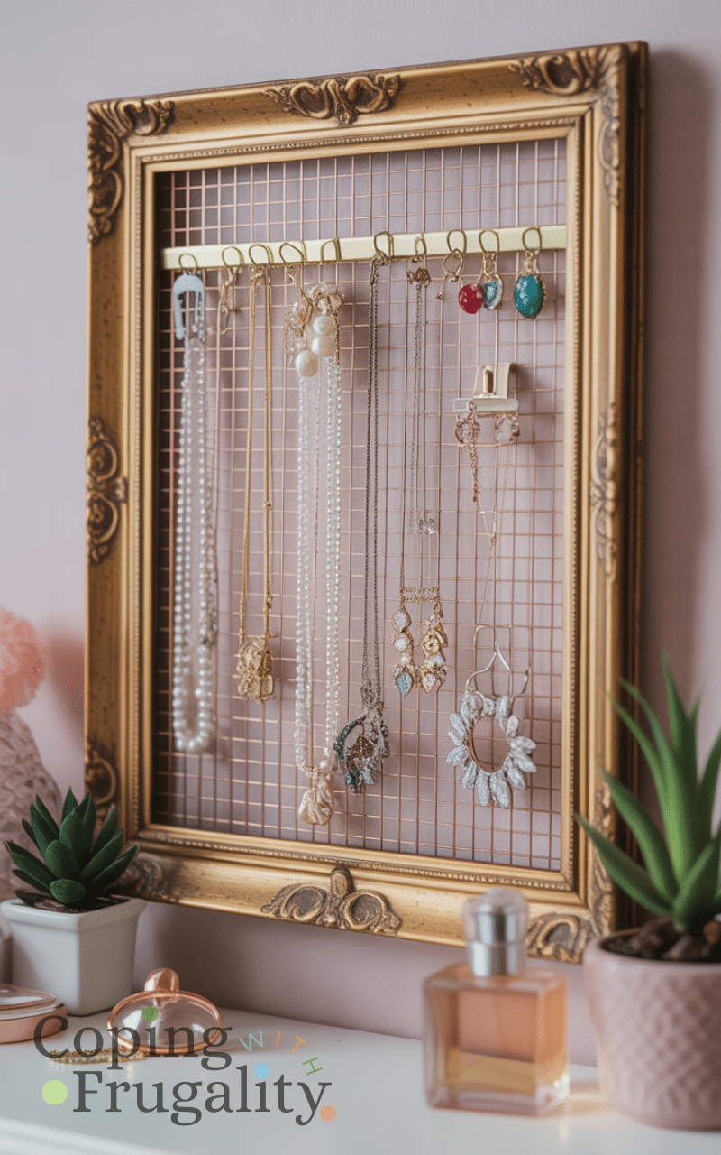 Small thrifted frames can become beautiful jewelry organizers, making them a clever DIY Decor from Thrifted Items on a Budget idea. Add hooks, wire, or mesh to hold necklaces and earrings. This project helps reduce clutter while adding decorative detail to your wall or dresser. Thrifted frames are cheap and easy to customize, making this both functional and stylish for bedrooms or dressing areas.