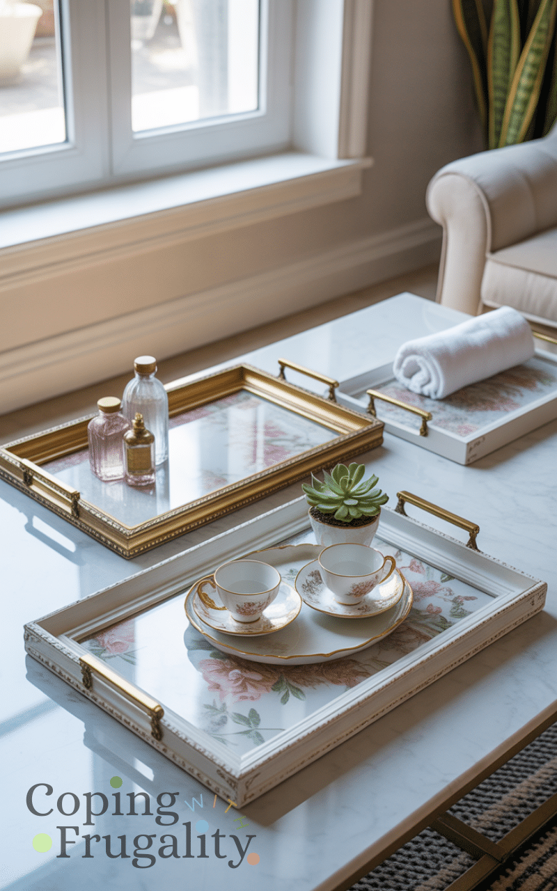 Turn large thrifted frames into decorative trays for an easy DIY Decor from Thrifted Items on a Budget idea. Remove the glass, add handles, and place decorative paper or fabric inside. These trays are great for coffee tables, vanities, or kitchen counters. Thrifted frames are inexpensive and easy to customize, allowing you to create functional decor that looks handmade and unique. This project adds charm without requiring advanced DIY skills.