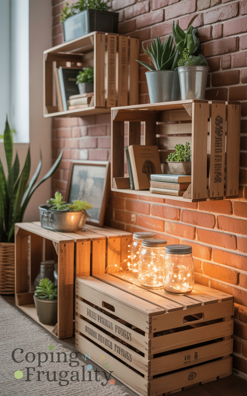 Wooden crates found at thrift stores can be transformed into shelves, storage units, or side tables. This DIY Decor from Thrifted Items on a Budget idea adds a rustic touch to your home. Sand and stain or paint the crates to match your style. They’re versatile, affordable, and perfect for organizing while decorating at the same time.