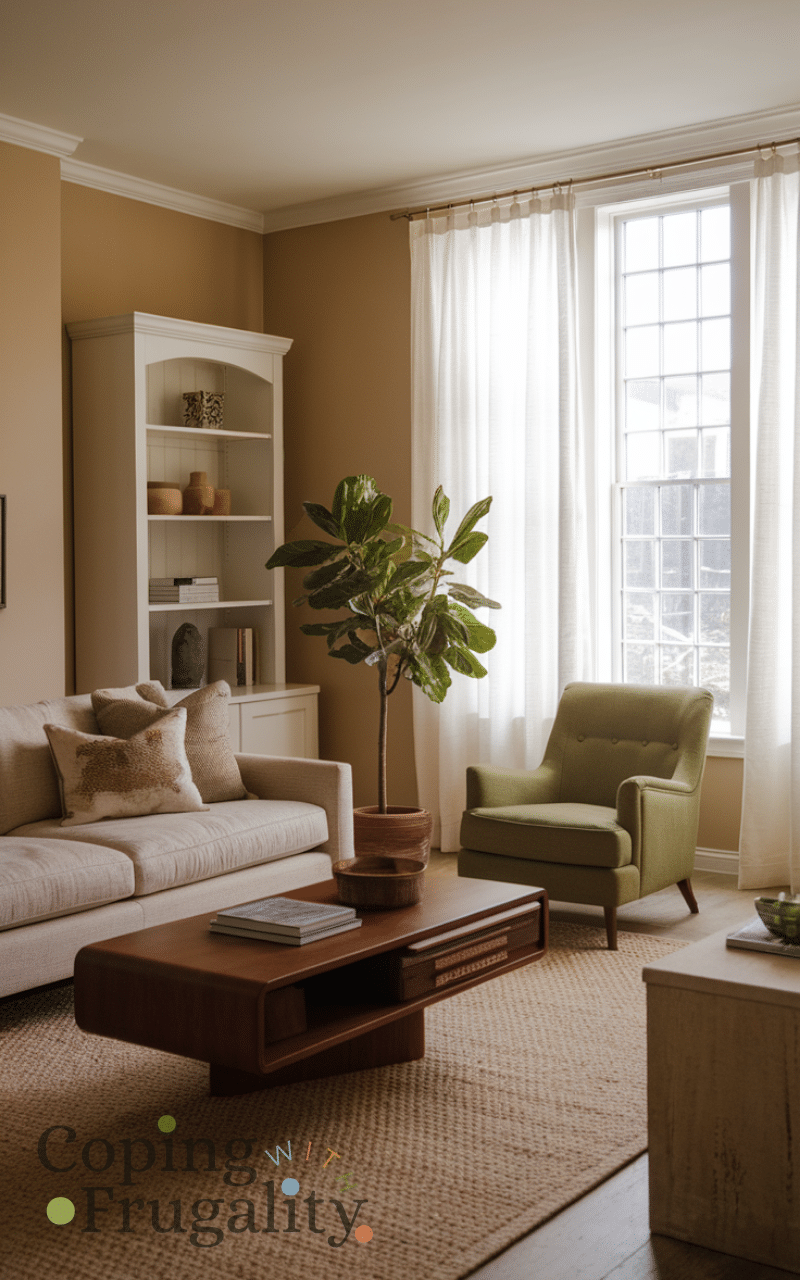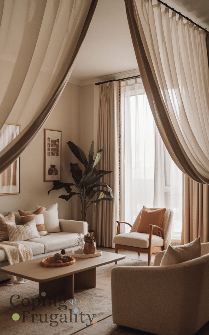 An easy early spring living room refresh on a budget begins with replacing thick winter drapes with airy sheer curtains that let natural light flood the space. Light fabrics instantly make your room feel brighter, bigger, and more welcoming while keeping privacy soft rather than harsh. This easy early spring living room refresh on a budget works especially well if you choose neutral whites, creams, or pale pastels that echo the feeling of blooming spring. You don’t need new rods or hardware, just a simple fabric change that transforms the mood of your entire space without spending much.