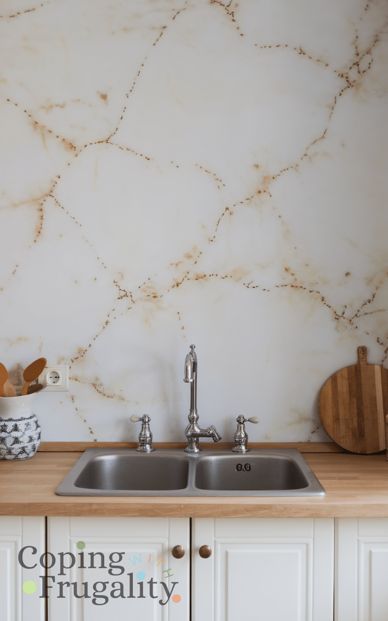 Vinyl wallpaper designed for kitchens is a smart option within the Best Easy Kitchen Backsplash Ideas on a Budget category. It comes in tile, stone, or marble patterns and is easy to apply and remove. Many versions are water-resistant and wipeable, making them practical for cooking areas. This idea works well if you want a fast transformation with minimal effort and maximum visual impact.