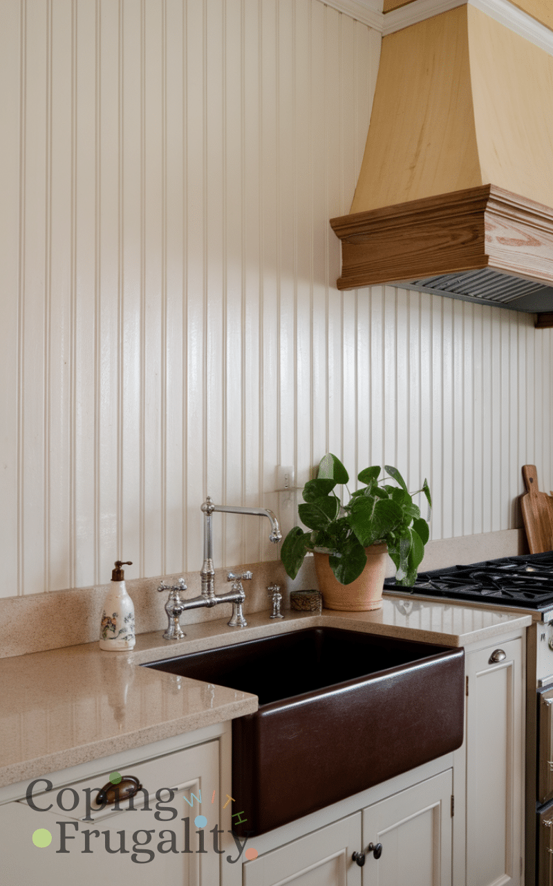 Beadboard panels bring a cozy, farmhouse feel and are among the Best Easy Kitchen Backsplash Ideas on a Budget for classic kitchens. These panels are lightweight, affordable, and easy to install using adhesive or nails. When sealed and painted, they become moisture-resistant and easy to clean. Beadboard works especially well in cottage-style or traditional kitchens and adds subtle texture without overwhelming the space.