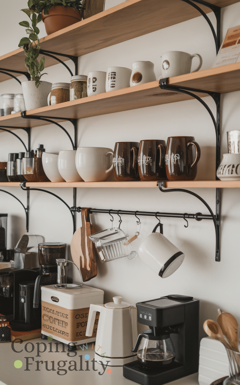 Open shelves are perfect for displaying mugs and coffee jars in a Kitchen Coffee Station Setup on a Budget. Instead of buying new furniture, use shelves you already have in your kitchen. Arrange cups, small plants, and coffee containers neatly for a decorative look. This setup saves money and makes everything easily accessible. Open shelving also helps your coffee station blend naturally with your kitchen décor, making it both practical and visually pleasing.