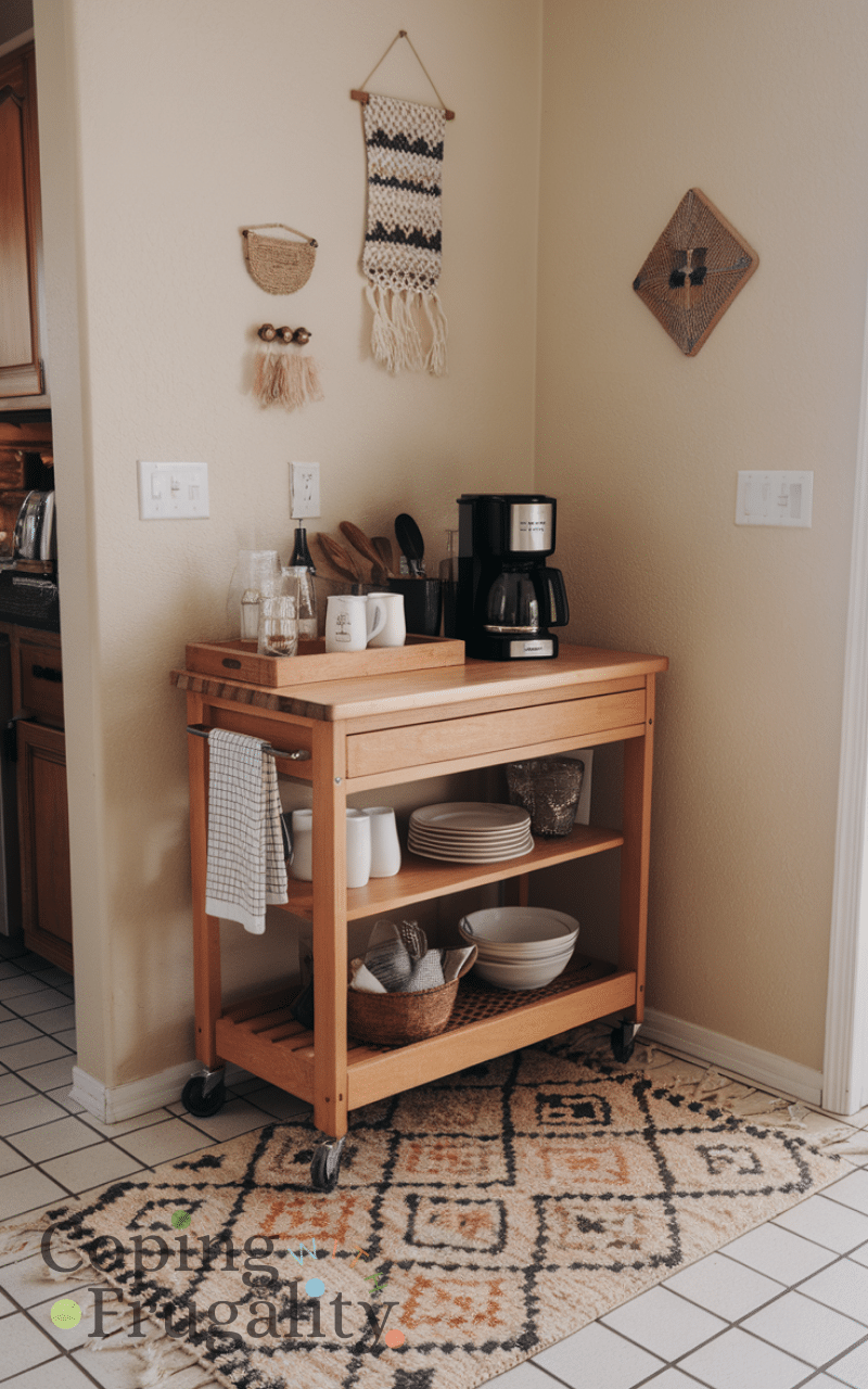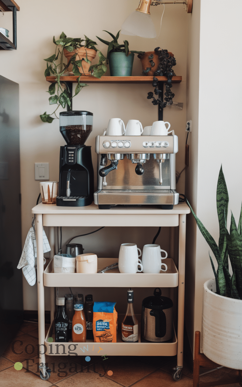 A rolling cart is a smart solution for a Kitchen Coffee Station Setup on a Budget, especially if you lack counter space. You can find budget carts online or reuse an old one. Store your coffee machine on top, mugs in the middle, and supplies like coffee beans or syrups below. The best part is flexibility—you can move it wherever you need. This idea works perfectly for small kitchens and adds a café-style vibe without any renovation or high cost.