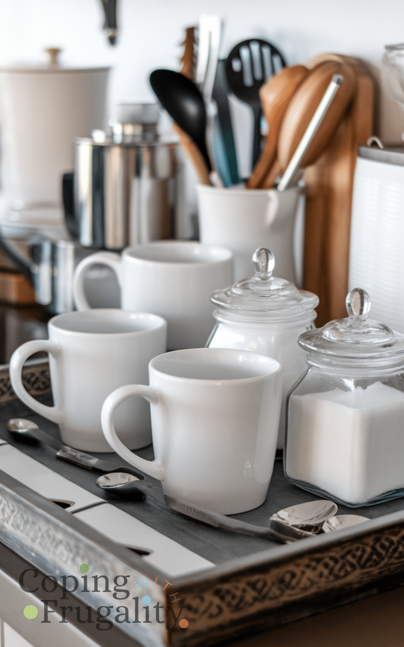 A simple tray is one of the easiest ways to start a Kitchen Coffee Station Setup on a Budget. It visually groups your coffee essentials like mugs, sugar jars, and spoons in one place. You can use a wooden, metal, or even plastic tray you already own. This keeps everything organized while making your coffee station look intentional and neat. Trays are affordable, easy to move, and perfect for small kitchens where space matters. It’s a small detail that instantly makes your coffee setup feel more put together without spending much.