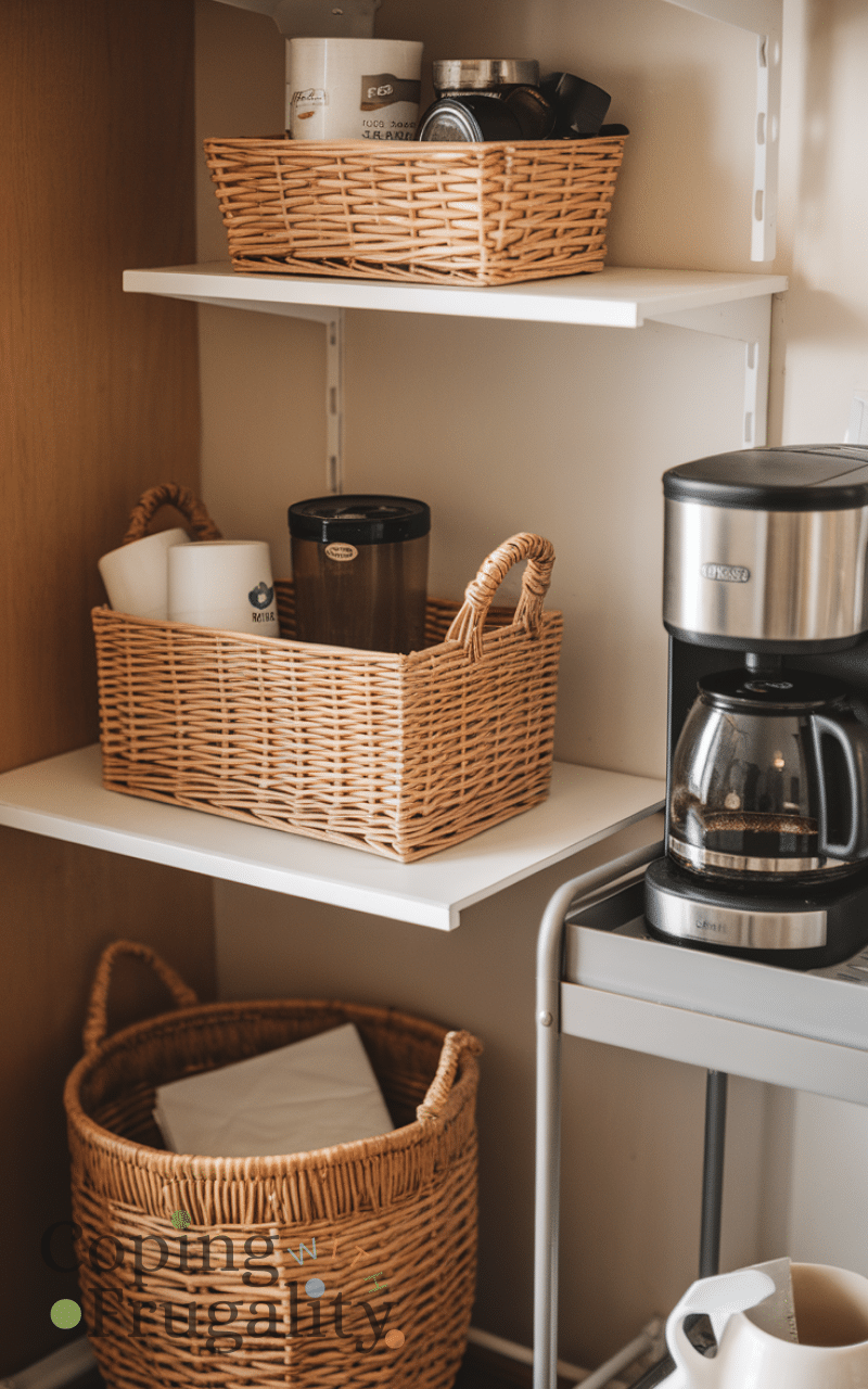 Baskets are great for keeping a Kitchen Coffee Station Setup on a Budget tidy. Use affordable baskets to store pods, filters, or napkins. They hide clutter while adding texture and warmth. You can place them on shelves, carts, or inside cabinets. This simple organization trick keeps everything neat and makes your coffee station look well-styled without spending much.
