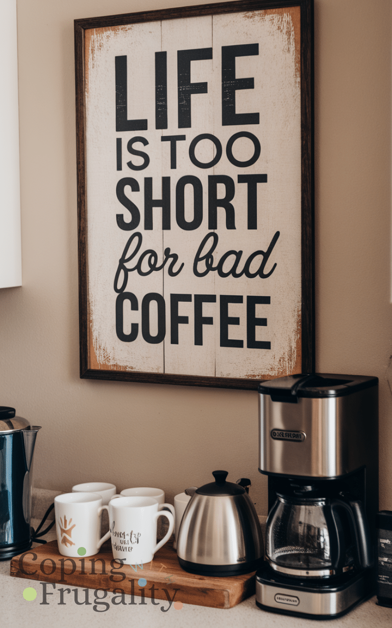 Wall art instantly upgrades a Kitchen Coffee Station Setup on a Budget. Print free coffee-themed quotes or buy inexpensive prints online. Frame them using budget frames or even clipboards. Coffee art adds personality and charm, making your station feel intentional and fun. This idea is perfect if you want a stylish look without investing in expensive décor.