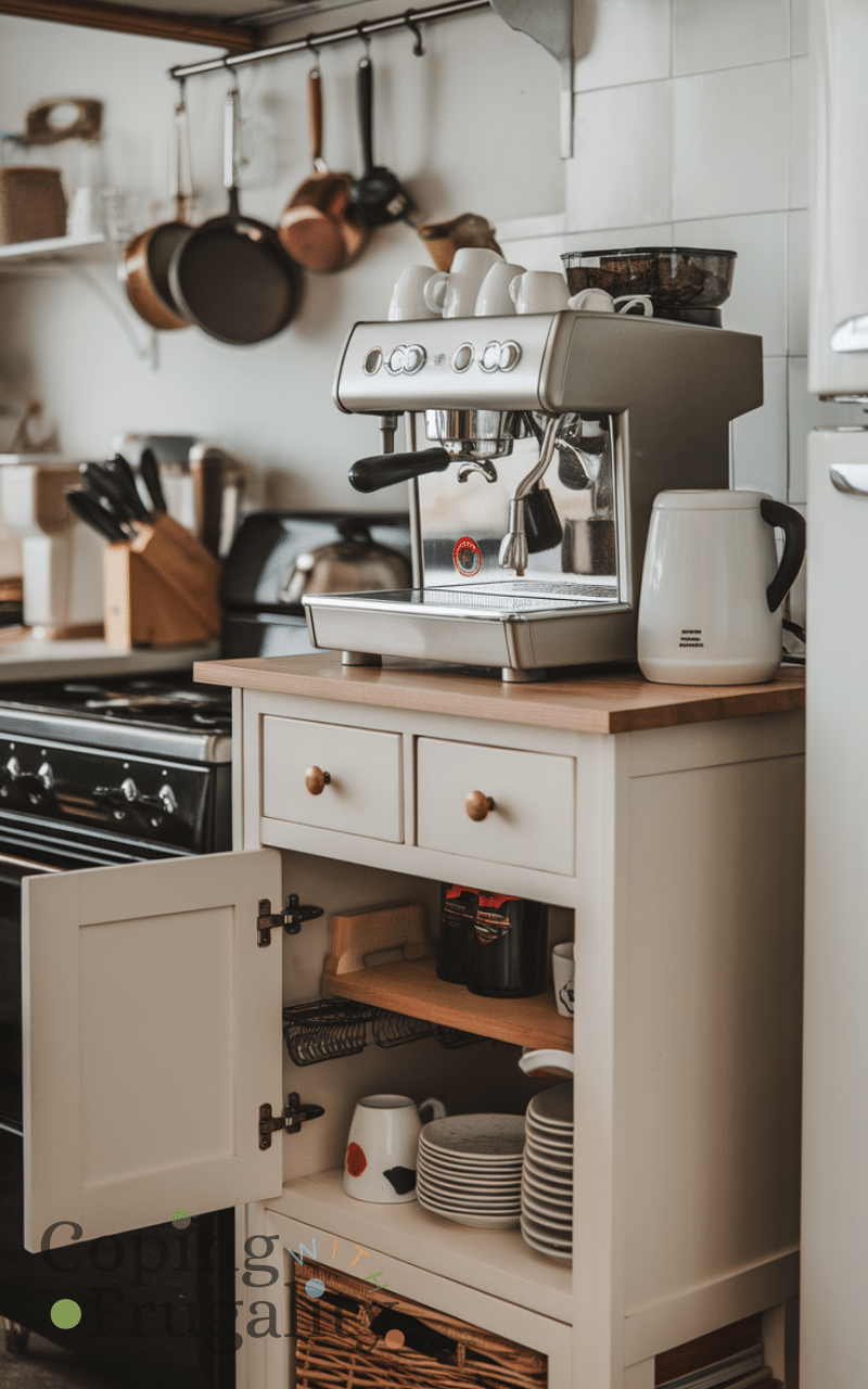 If you have a small sideboard or cabinet, it’s perfect for a Kitchen Coffee Station Setup on a Budget. Use the top for your coffee machine and the inside for storage. You don’t need to buy new furniture—repurposing what you already own saves money and space. This setup works especially well in open kitchens and keeps your coffee essentials neatly stored and easy to reach.