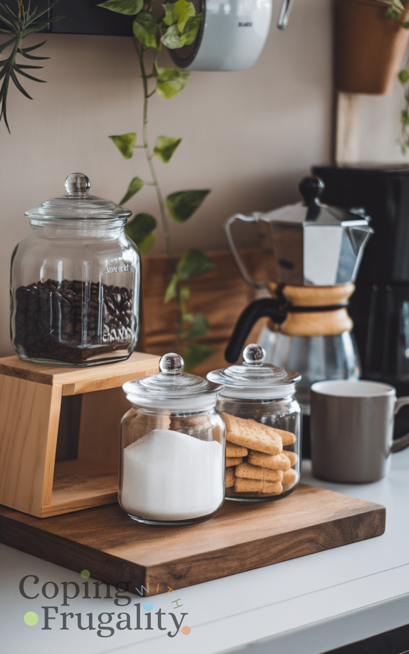 Glass jars are both practical and stylish for a Kitchen Coffee Station Setup on a Budget. Reuse old jars or buy affordable ones to store coffee, sugar, and biscuits. Clear jars make it easy to see what you have while giving your station a clean, organized look. Label them for a charming touch. This simple storage solution keeps everything fresh and visually appealing without spending much money.