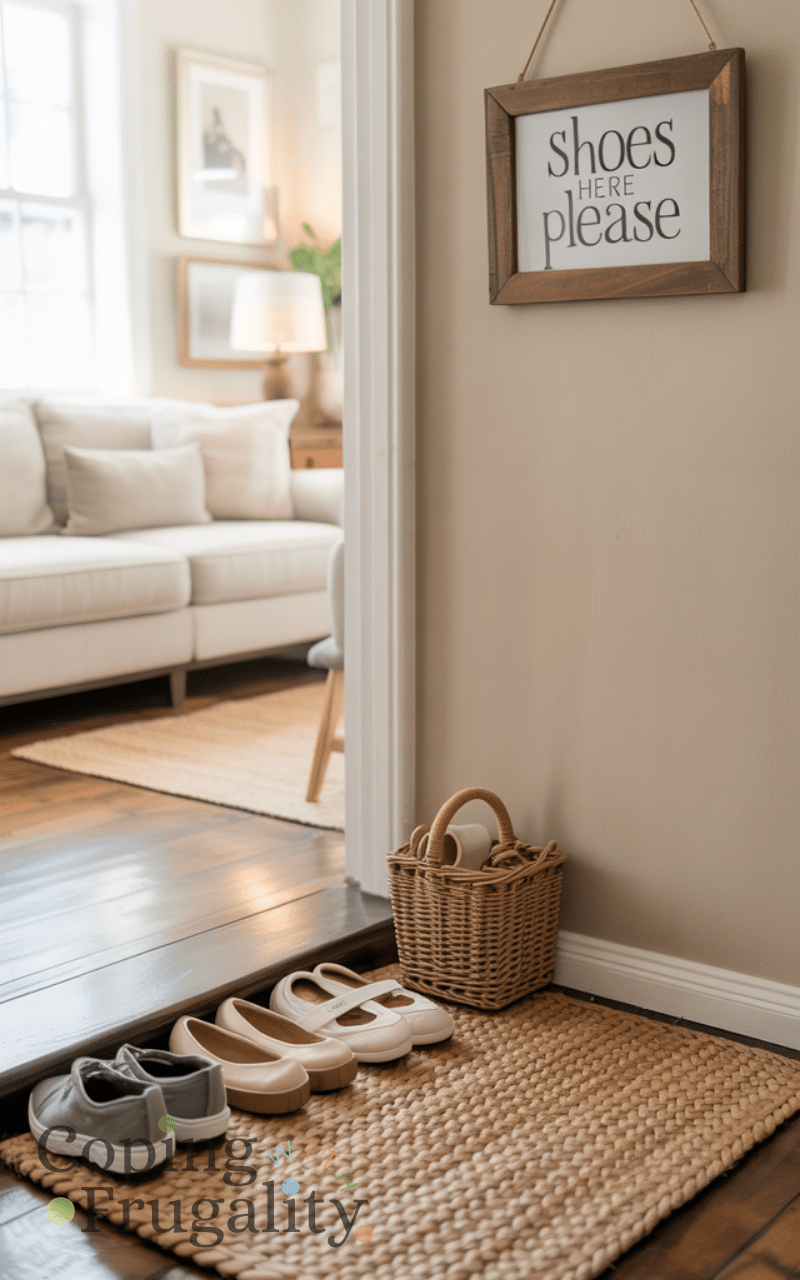 Sometimes the simplest entryway shoe storage ideas on a budget are the most effective. A designated shoe mat paired with clear organization rules keeps shoes tidy without furniture. This solution costs very little and works well in compact homes. Adding a small sign or basket nearby reinforces the habit while keeping the entryway clean and clutter-free.